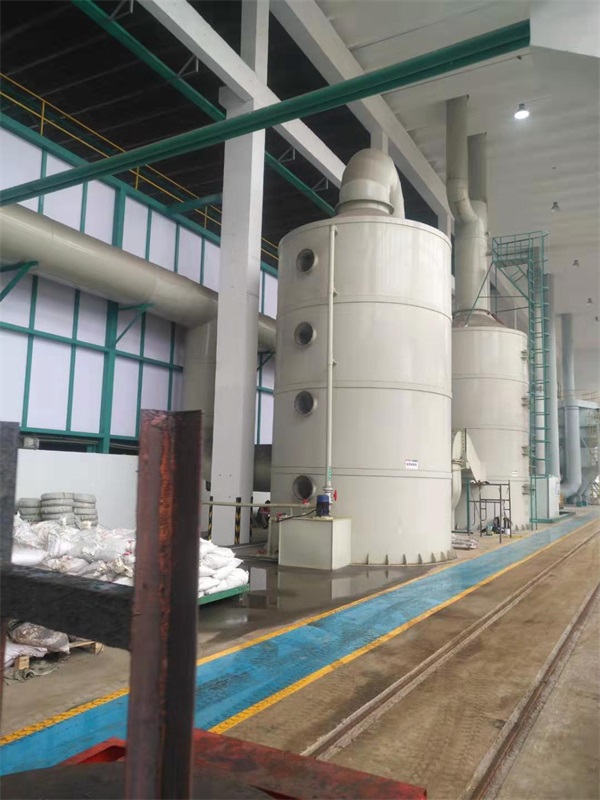 溫州客戶噴淋塔安裝現(xiàn)場(chǎng),酸霧廢氣由風(fēng)管引入凈化塔,經(jīng)過填料層,廢氣與氫氧化鈉吸收液進(jìn)行氣液兩相充分接觸吸收中和反應(yīng),酸霧廢氣經(jīng)過凈化后,再經(jīng)除霧板脫水除霧后由風(fēng)機(jī)排入大氣。吸收液在塔底經(jīng)水泵增壓后在塔頂噴淋而下,***后回流至塔底循環(huán)使用。